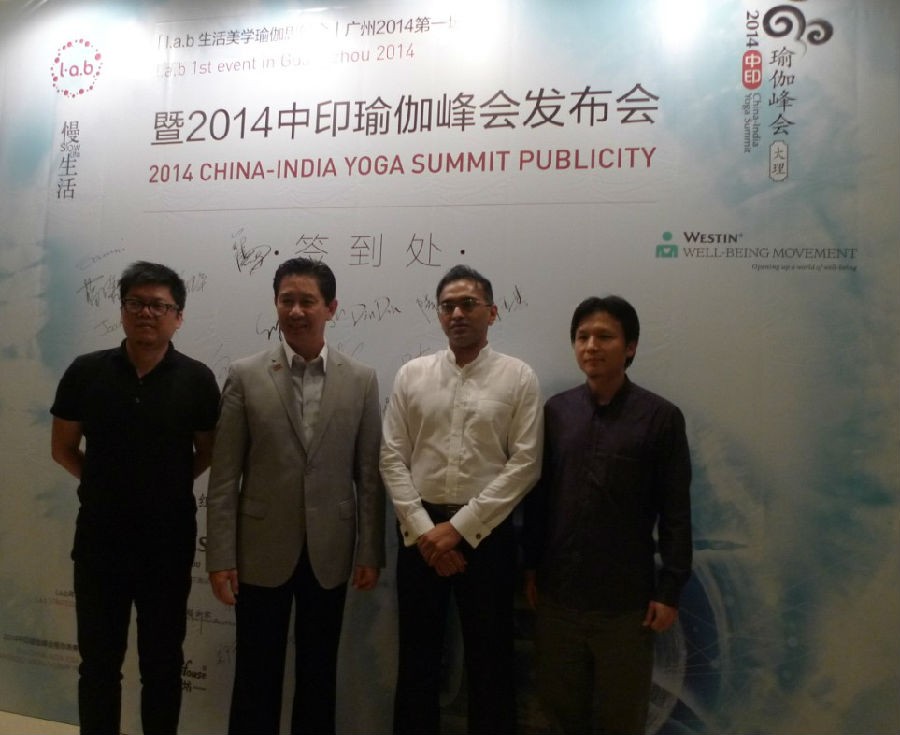 2014年4月18日晚间,“2014中印瑜伽峰会发布会暨生活美学瑜伽思辨会”,在广州海航威斯汀酒店大宴会厅举办。此次发布暨思辨会共有逾百位瑜伽爱好者与众多专业瑜伽机构莅临现场,中印瑜伽峰会组委会邀请到包括印度总领事高志远Mr.K.Nagaraj Naidu、中印瑜伽峰会组委会秘书长陈思、中国艾扬格瑜伽协会会长、中国艾扬格瑜伽学院客座讲师——沈詠珮和城市画报主编刘琼雄在内的行业重量级嘉宾,共同掀起瑜伽作为生活方式和文创产业的健康风潮。