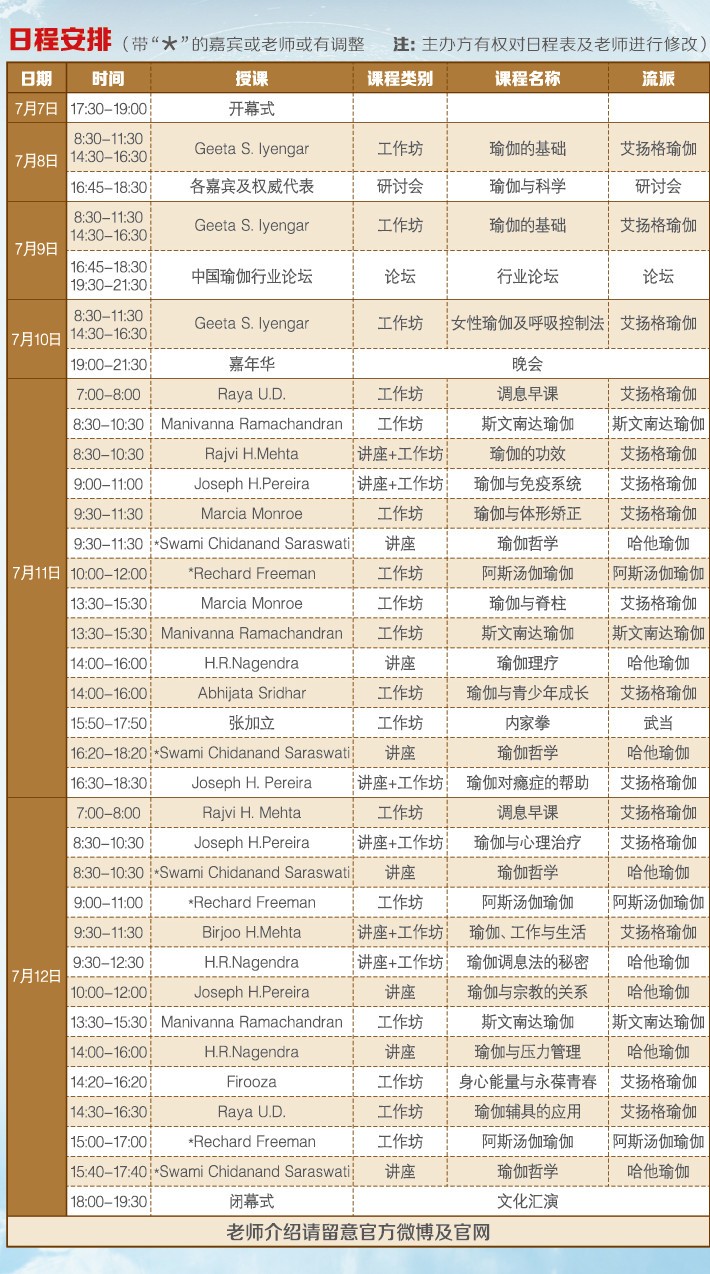师资阵容的强大,课程安排更不用说了!为期3天的Geetaji艾扬格瑜伽大课+两天的各派别大师的工作坊及讲座,日程安排相当丰富。