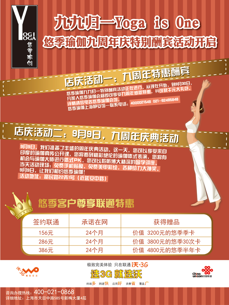 悠季瑜伽九九归一特别酬宾活动正在进行。从现在开始,到9月30日,凡加入悠季瑜伽会籍即可享受九周年感恩特惠,并可获千元大礼包。详情请致电各悠季瑜伽会馆。