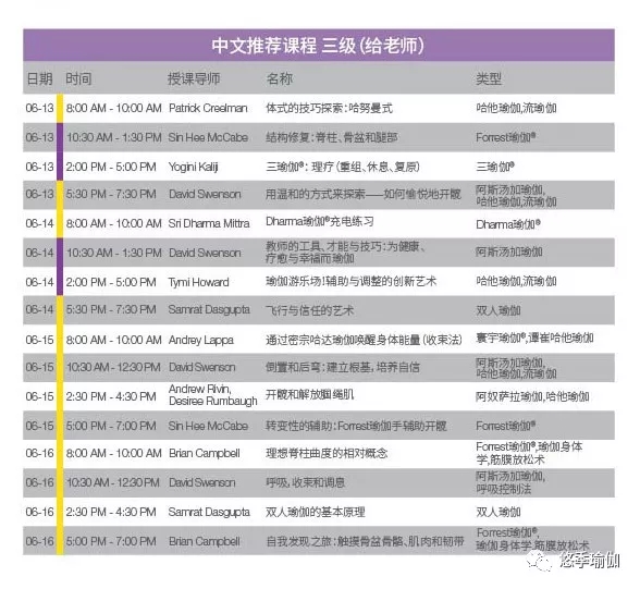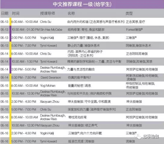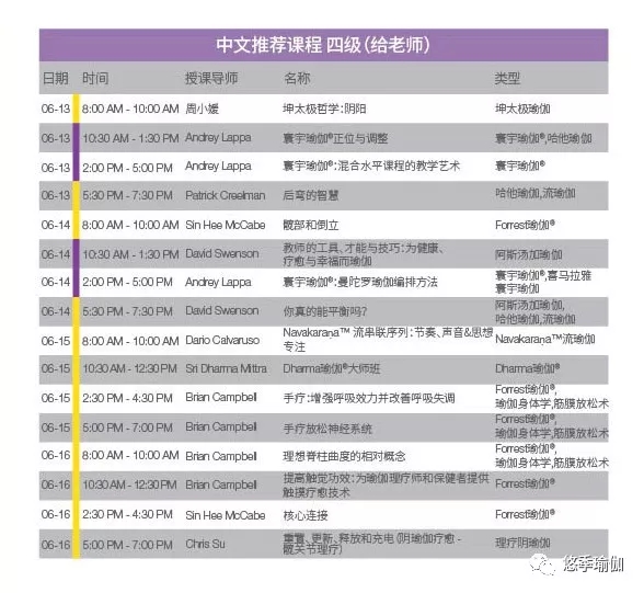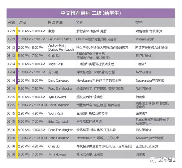 不知道怎么选课?我们为在大会期间有特定目标的练习者或难以从众多课程中做选择的与会者特别设计了五份课表。其中四份课程表都带有中文翻译或以中文授课,从参与者的角度来考虑,让参会变得更简单明了。所有课表可在注册过程中自行定制。